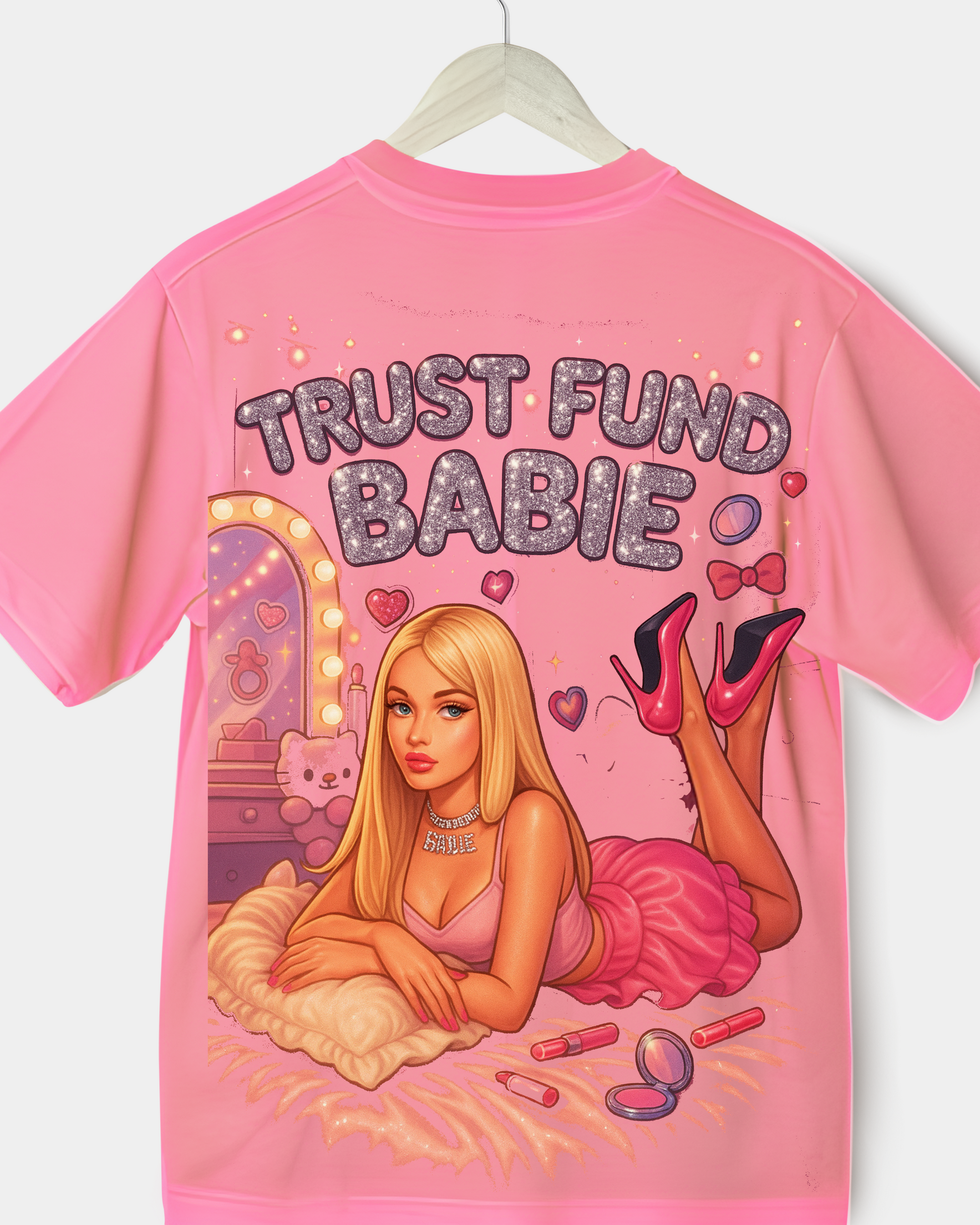 Premium t-shirt featuring glamorous Y2K-inspired design. Pink aesthetic with luxury fashion motifs perfect for vintage style enthusiasts.